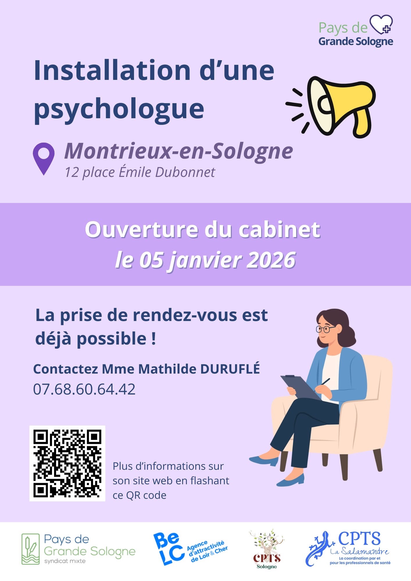 Mathilde Duruflé, psychologue clinicienne , ouvre son cabinet le 02/01/2026 à Montrieux en Sologne (dans l'ancien cabinet médical resté vacant).