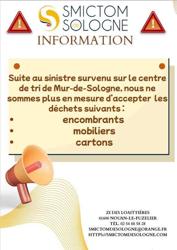 Suite à un incendie à la déchèterie de Mur de Sologne, les autres déchèteries du SMICTOM ne peuvent plus recevoir d’autres déchets.